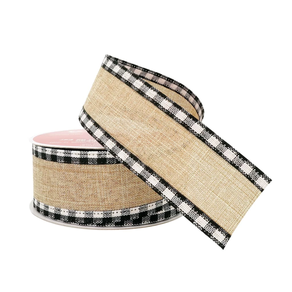 Give your Christmas gifts and crafts a lovely bit of country charm with this wired faux linen ribbon from Celebrate It. Natural brown with black and white gingham edges, use to embellish ornaments, pair with lights and greenery for lovely garlands and wreaths, put the finishing touch on presents and more!
