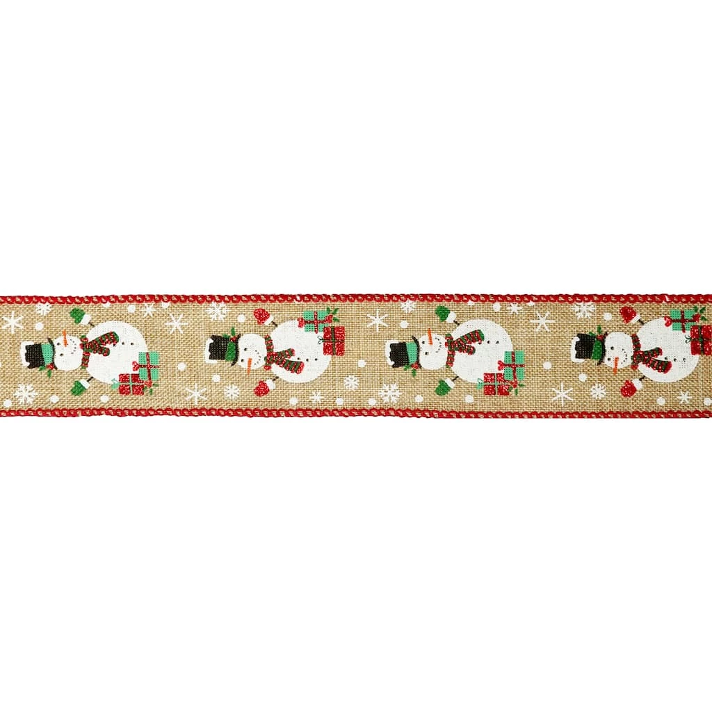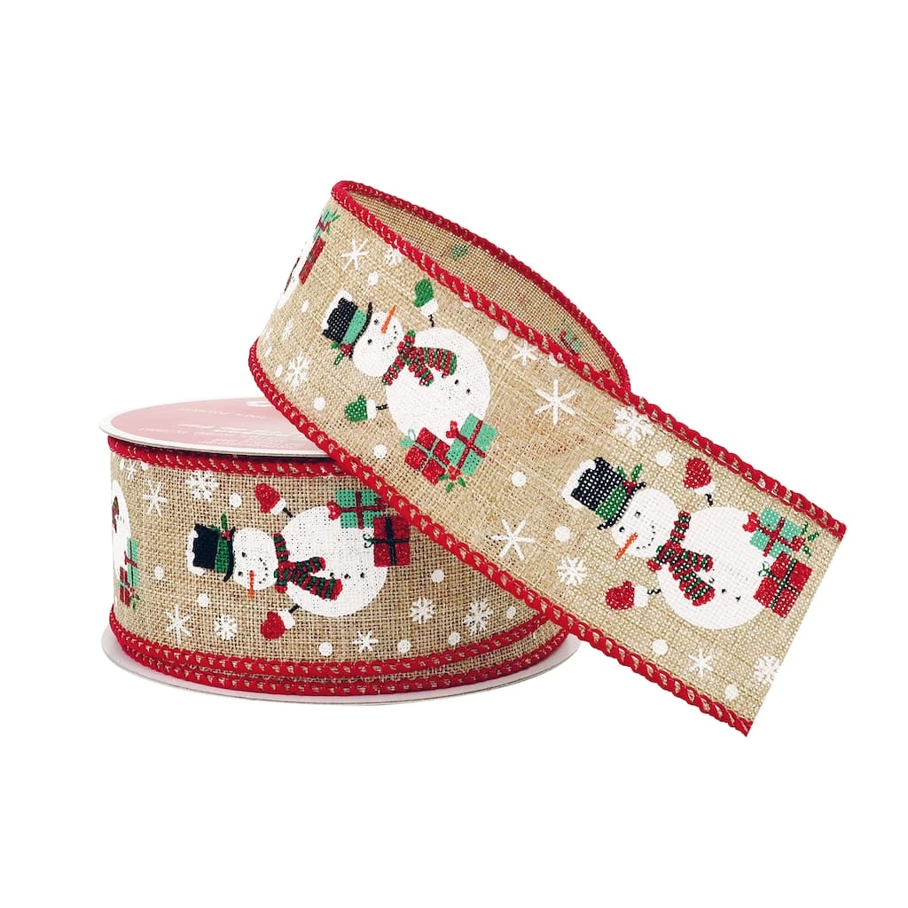 Give your Christmas gifts and crafts a lovely bit of wintry charm with this wired faux linen ribbon from Celebrate It. With edges stitched with a red thread and a festive snowman design, use to embellish ornaments, pair with lights and greenery for lovely garlands and wreaths, put the finishing touch on presents and more!