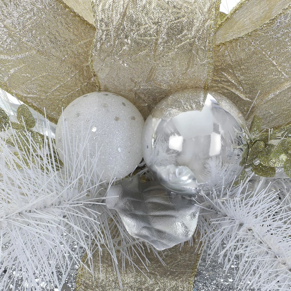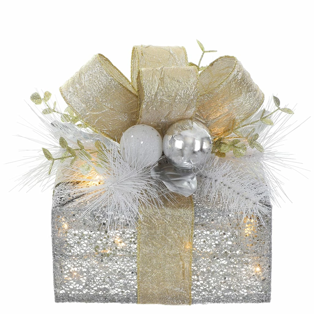 The glittery pine gift box is an attractive accent piece for adding to your holiday decorating scheme. This piece features a handcrafted gift box with pine branch tips, ornaments, and a bow. It is pre-lit with battery-operated LED lights. Display this holiday trimming in indoor locations.