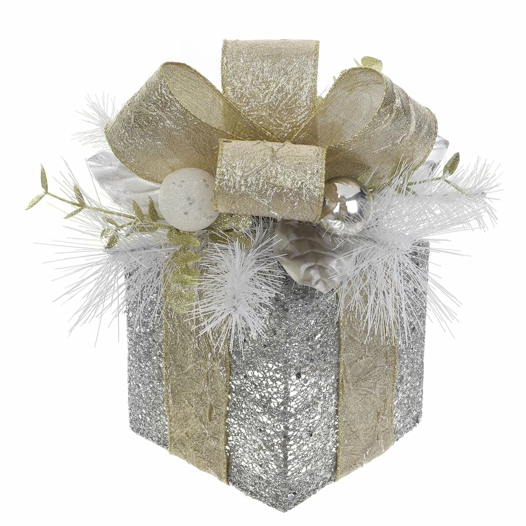 The glittery pine gift box is an attractive accent piece for adding to your holiday decorating scheme. This piece features a handcrafted gift box with pine branch tips, ornaments, and a bow. It is pre-lit with battery-operated LED lights. Display this holiday trimming in indoor locations.