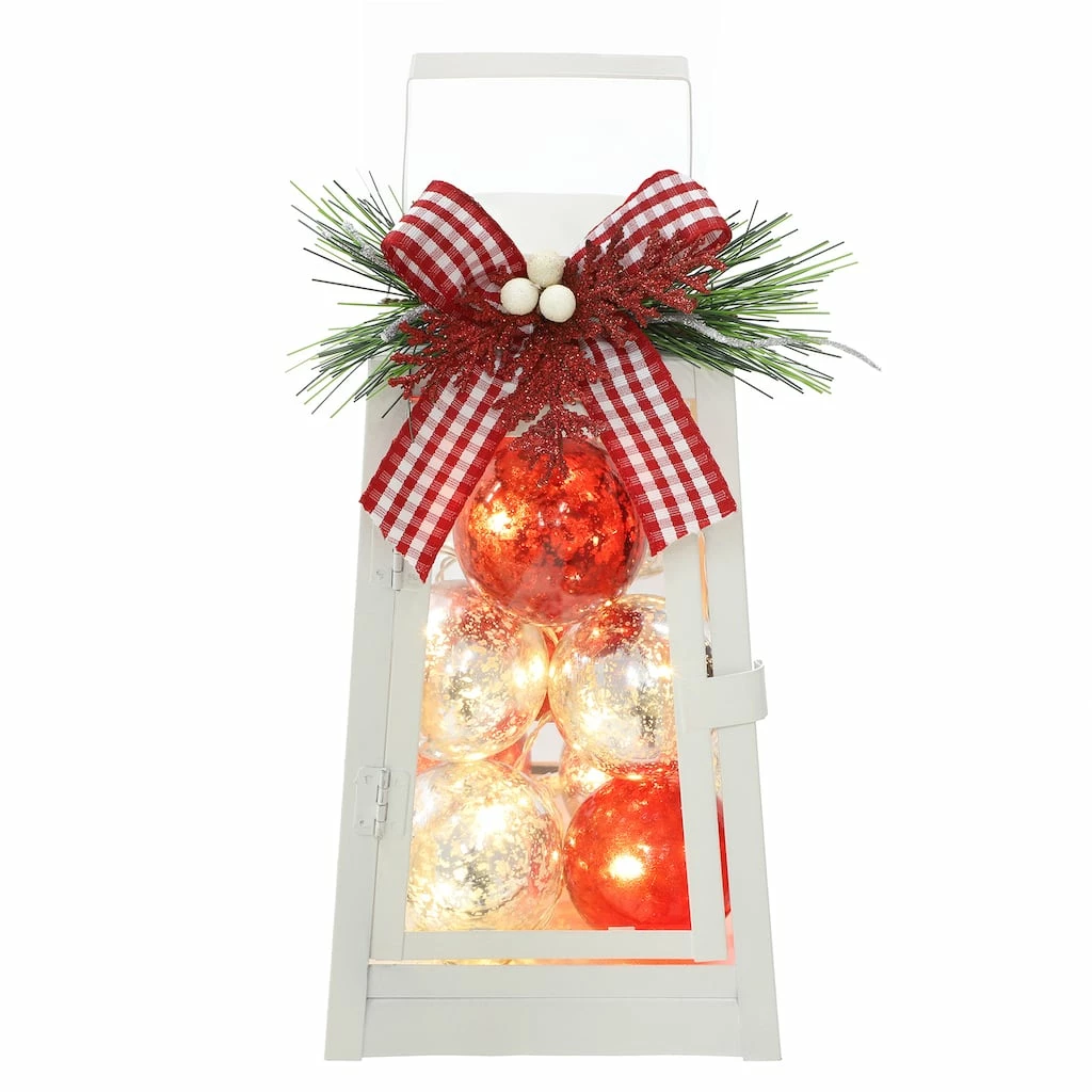 This festive lantern features battery-operated LED lights filled with shiny ornaments. Accented with a bow, pine branches and holly berries, this tabletop décor will be a great addition to your Christmas décor.