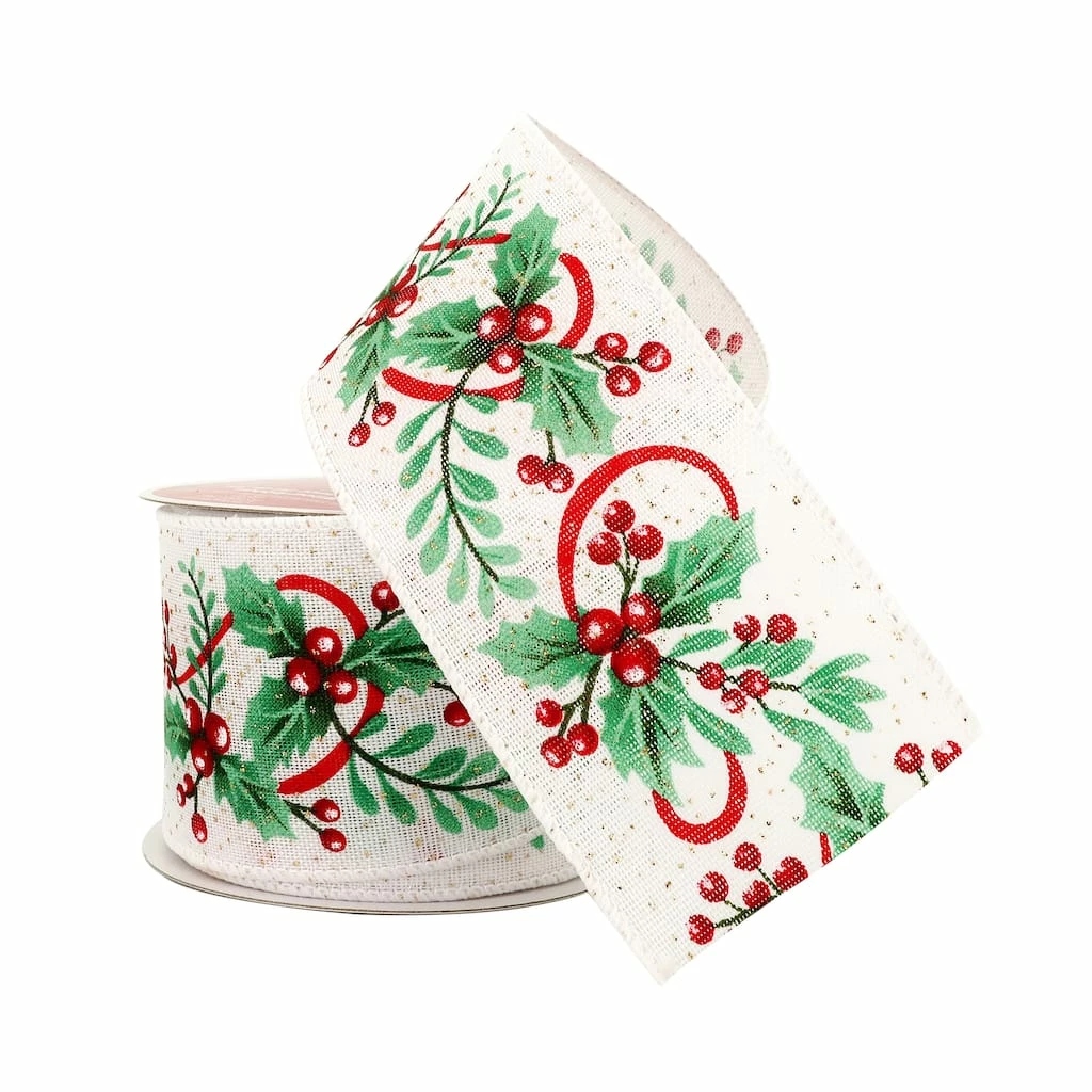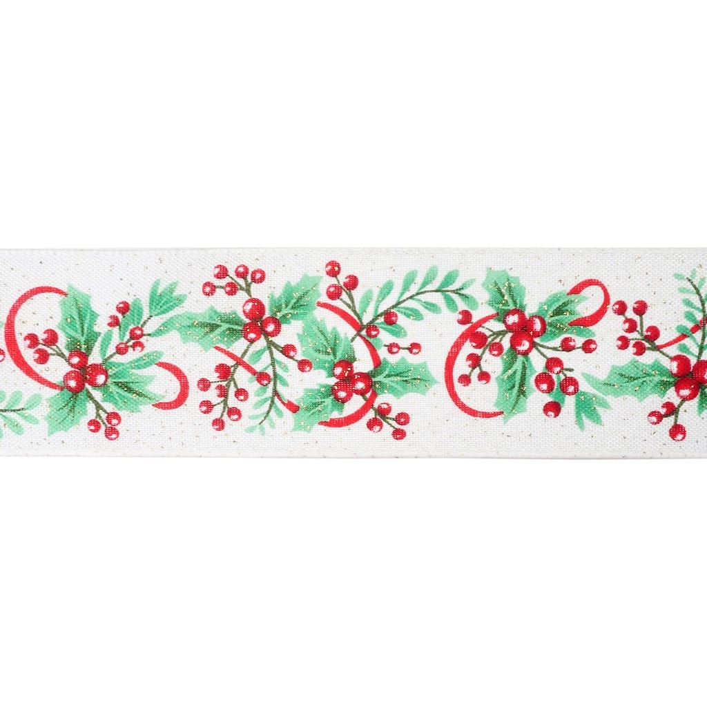 Give your Christmas gifts and crafts a lovely bit of cheer with this wired faux linen ribbon from Celebrate It. With a festive design featuring holly and mistletoe, use to embellish ornaments, pair with lights and greenery for lovely garlands and wreaths, put the finishing touch on presents and more!