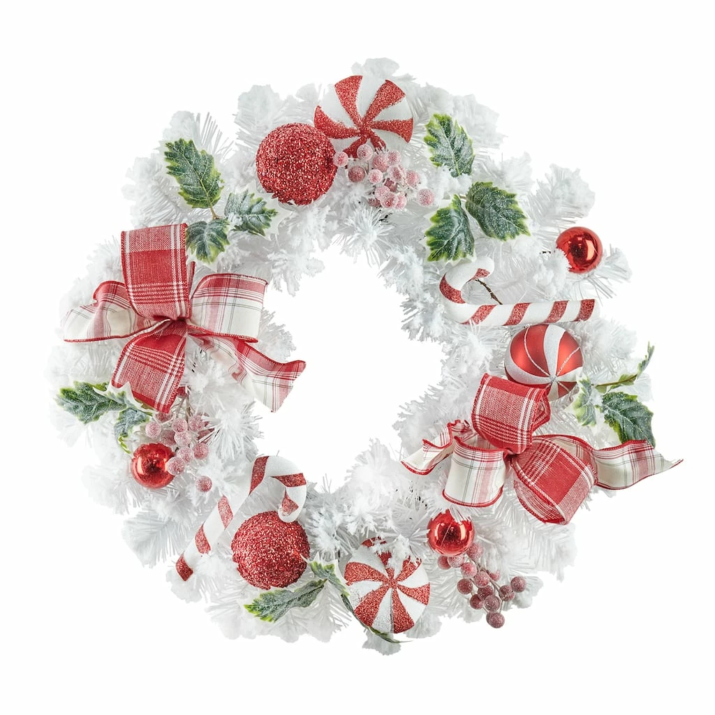 This candy cane, ornament, and holly berry wreath is perfect for showing off in your living area. Place it on your wall, window, or mantel to lend your home a festive touch.