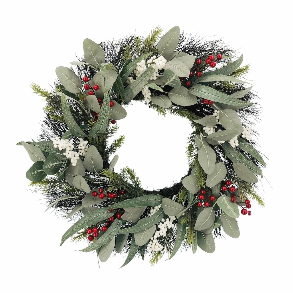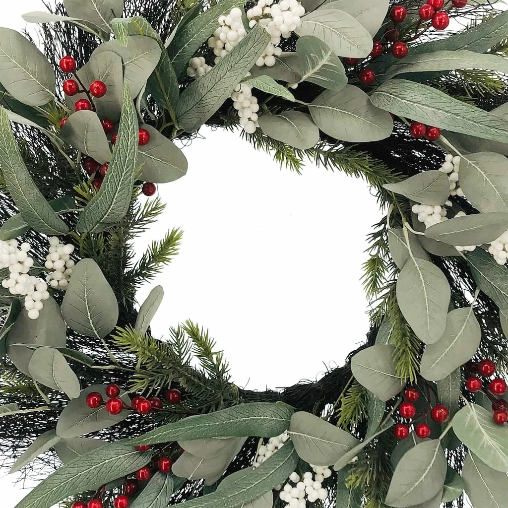 This berry wreath accented with a bundle of eucalyptus and pine branches will add a lovely touch of cheer to your holiday dΓ©cor. Add bird figurines, pinecones and ribbon, lights and more for a wonderful festive display to greet your guests this Christmas season.