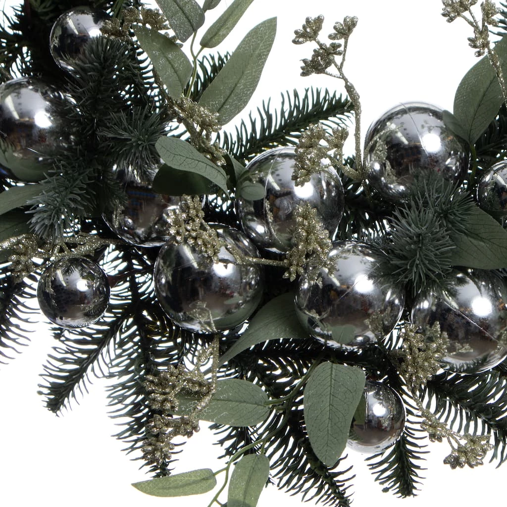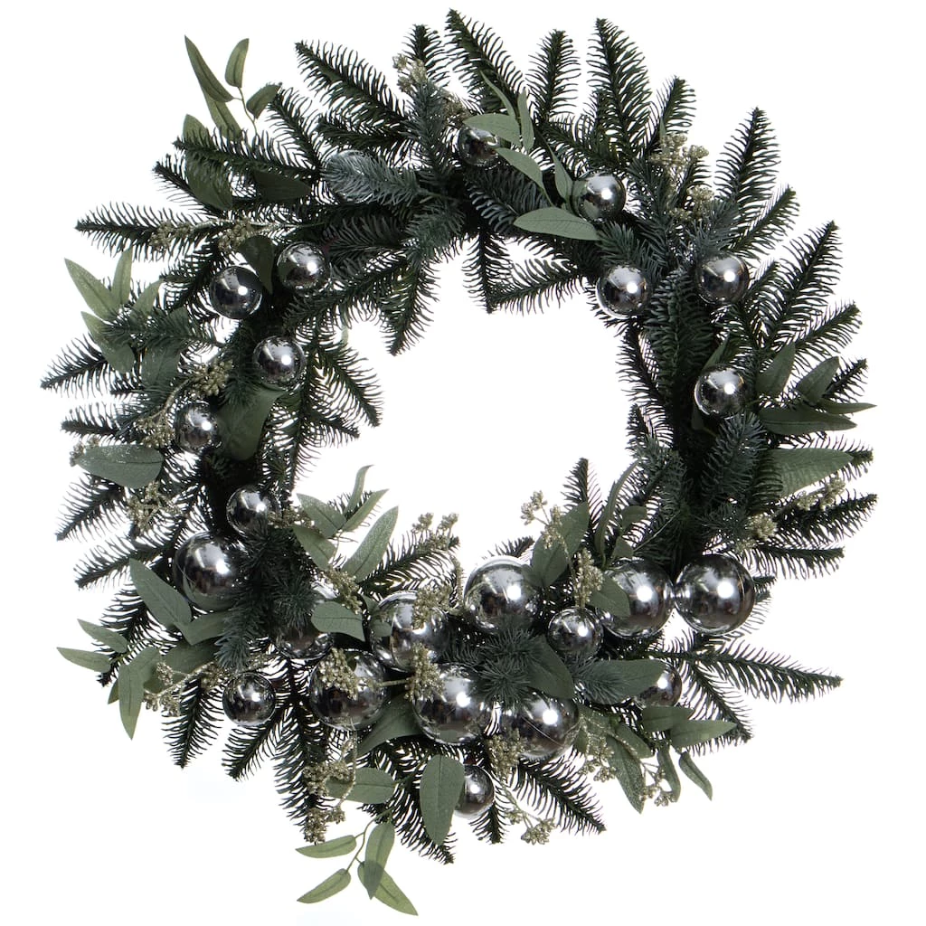 This ornament wreath accented with a bundle of eucalyptus and pine branches will add a lovely touch of cheer to your holiday dΓ©cor. Add bird figurines, pinecones and ribbon, lights and more for a wonderful festive display to greet your guests this Christmas season.