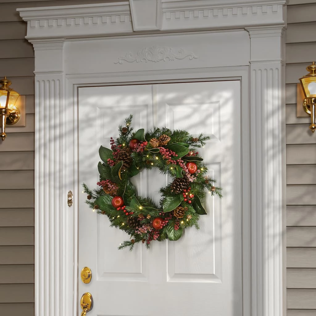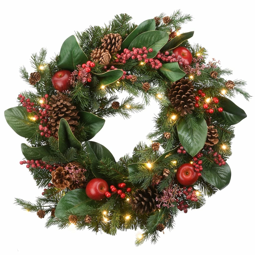 This decorated evergreen wreath features a homey design with trimmings that include apples, pinecones branch sprigs and red berry clusters. It is pre-strung with 50 battery-operated warm white LED lights that are energy-efficient and long lasting. Included is an option for 6 hours ON/18 hours OFF timed operation. Also included is a convenient handheld remote to control the lights. This attractive holiday wreath can be displayed on doors, walls, and windows in indoor or covered outdoor locations.