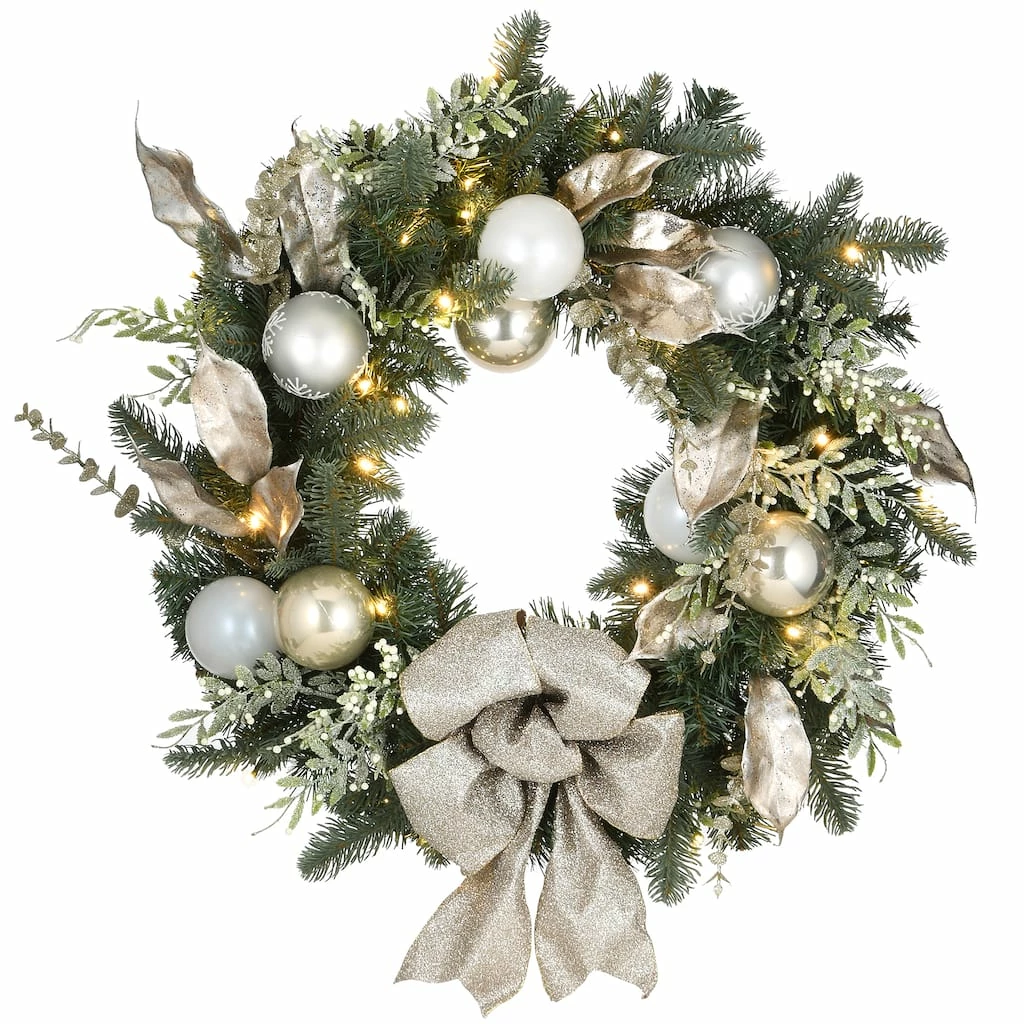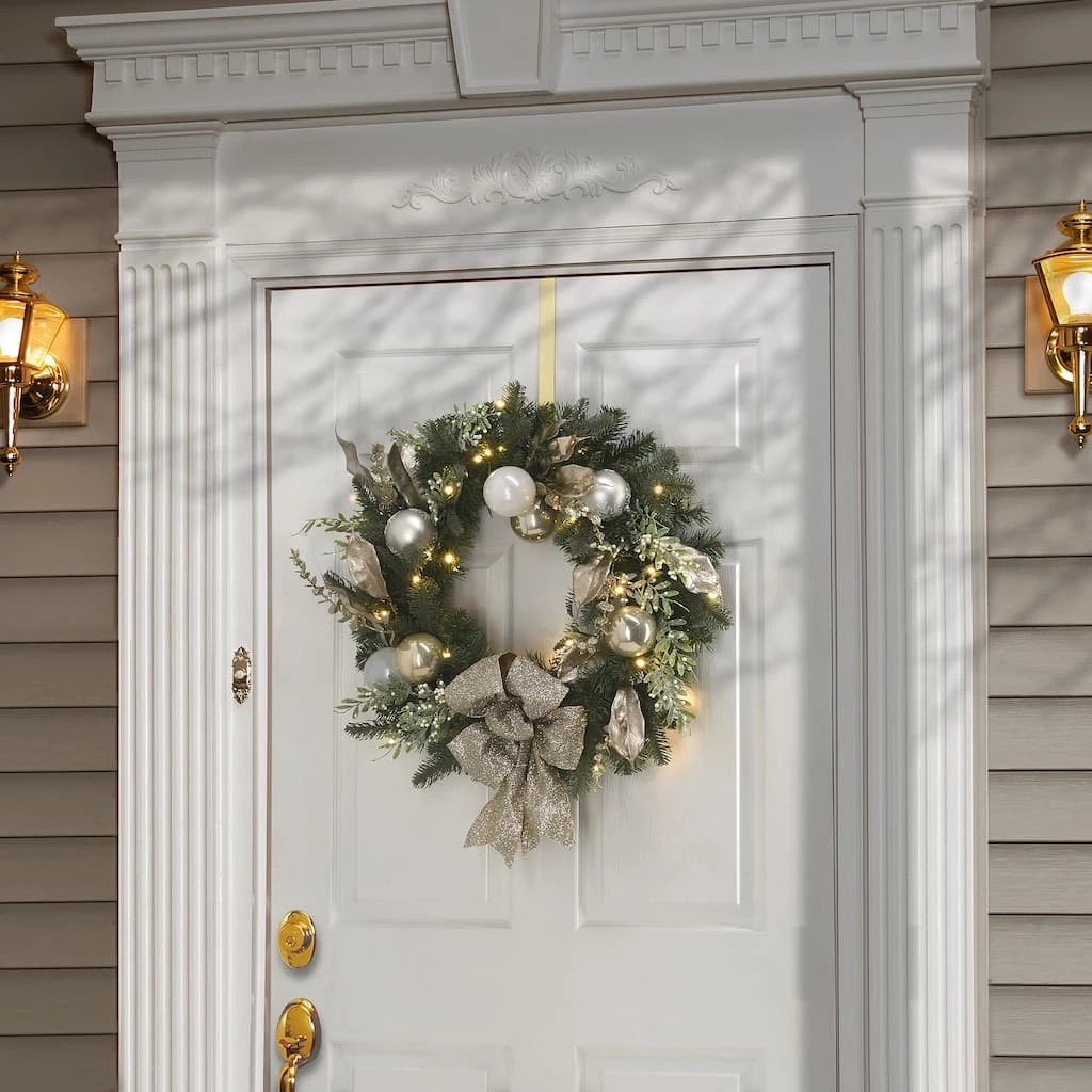 Glamorous and elegant, this evergreen wreath features a mixture of sparkled branch sprigs, silver leaves, and shiny ball ornaments swirling around a sturdy wire ring base, trimmed with a glittered fabric bow. It is pre-strung with 50 battery-operated warm white LED lights that are energy-efficient and long lasting. Included is an option for 6 hours ON/18 hours OFF timed operation. Also included is a convenient handheld remote to control the lights. This alluring holiday wreath can be displayed on doors, walls, and windows in indoor or covered outdoor locations.