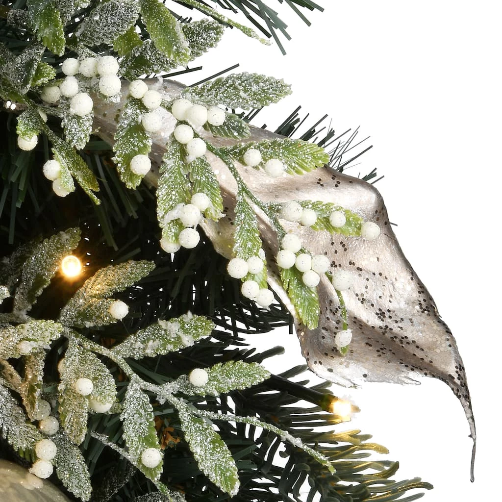- Evergreen with sparkled branch sprigs, silver leaves, and shiny ball ornaments