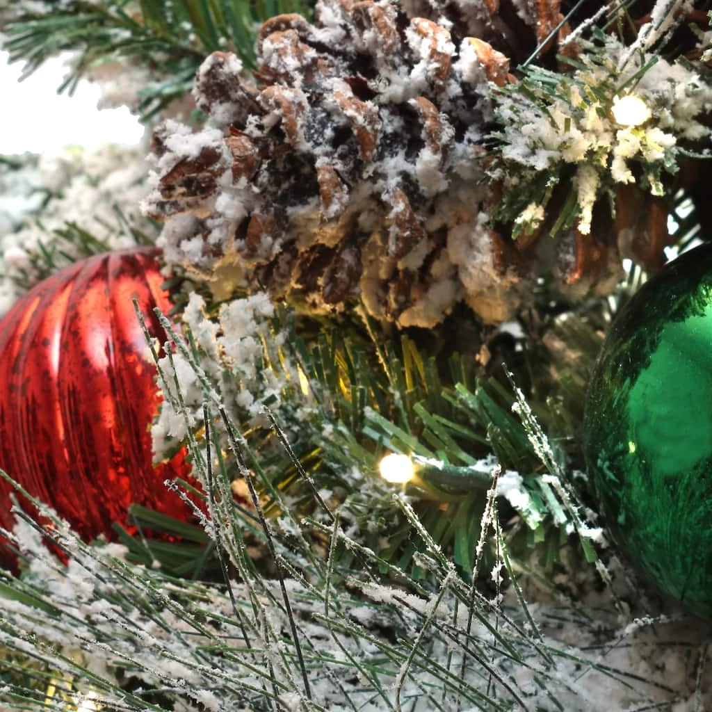 - Decorated with red and green ball ornaments, pinecones, and berries clusters