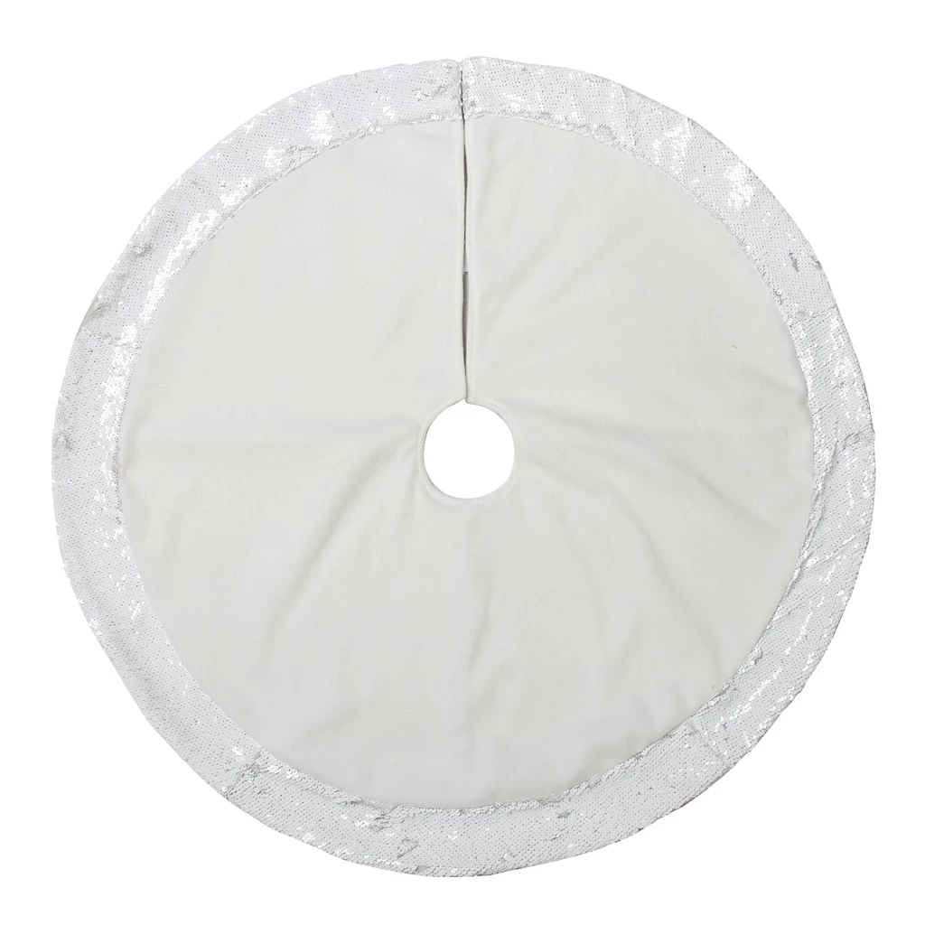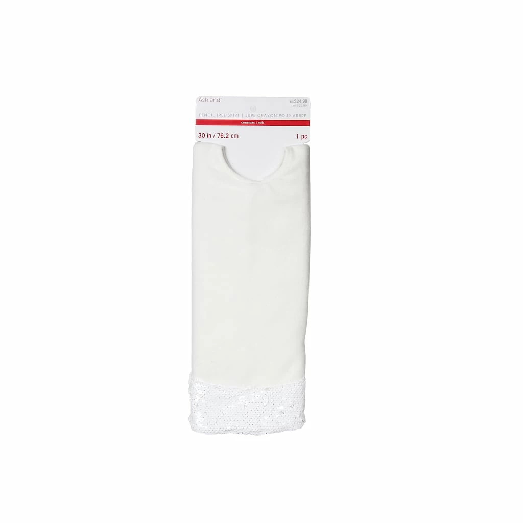 This white and sequined pencil tree skirt is guaranteed to complement your tree. Team it with bright ornaments and lights for the perfect holiday display.