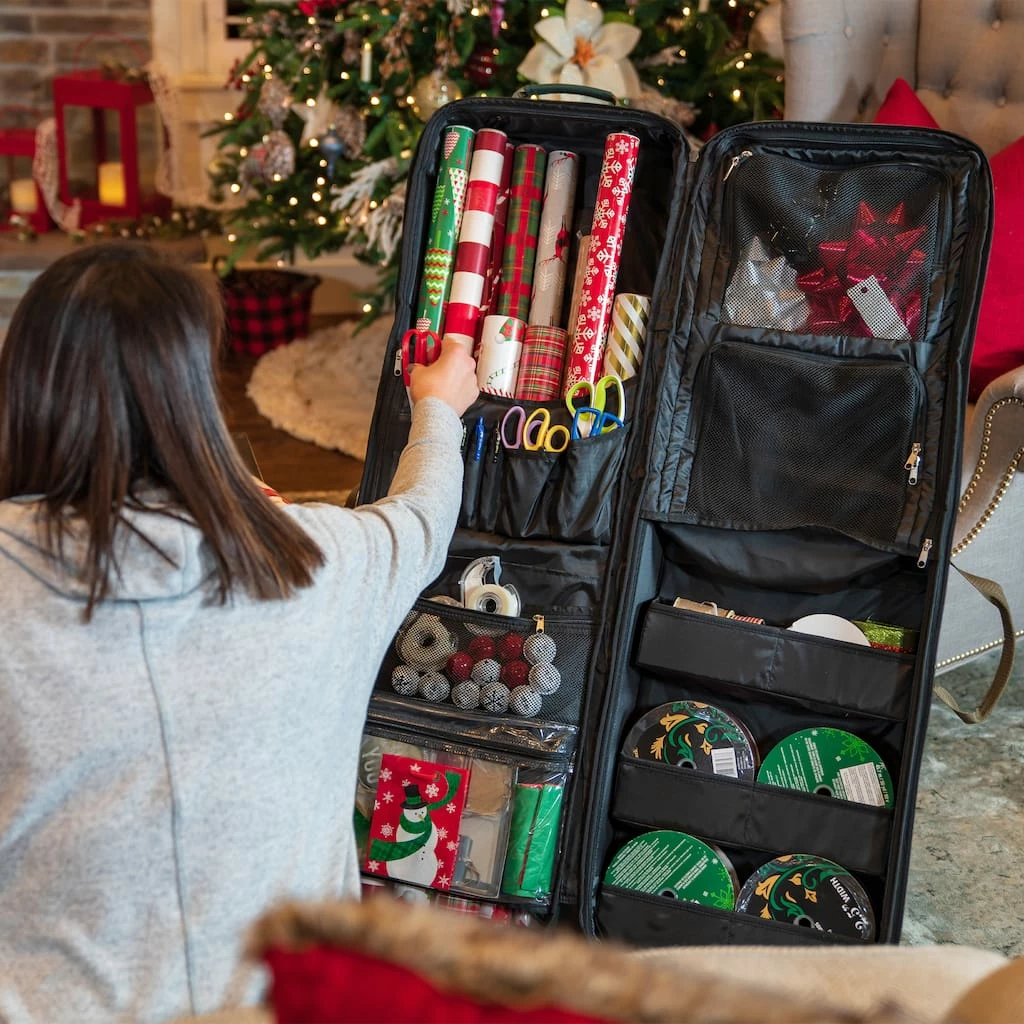 Storing all your gift wrap and crafting supplies in multiple containers and locations is an organizational nightmare. This deluxe gift wrap and craft station keeps all wrapping paper, bows, ribbon and more in a single efficient space that can easily be moved to any location your work station happens to be at that time. Once rolled to your work station, simply open and lean it back onto its built-in kickstand to have quick and easy access to everything you could need.