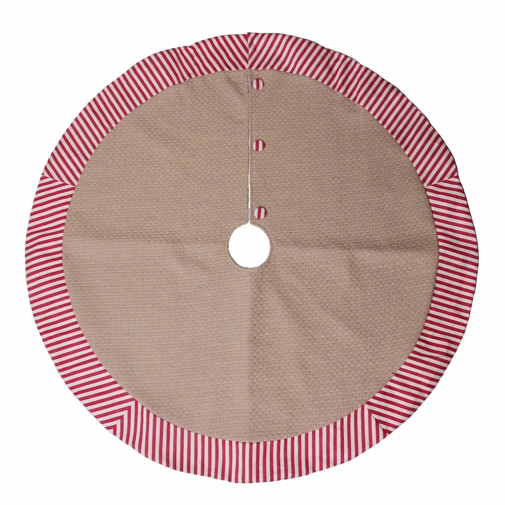 This burlap tree skirt with red and white stripes is guaranteed to complement your tree. Team it with bright ornaments and lights for the perfect holiday display.