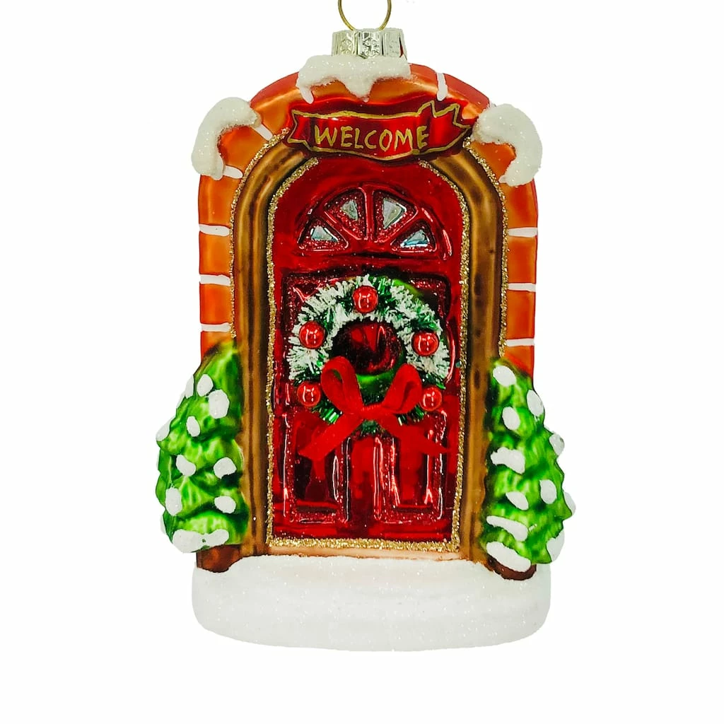 This unique ornament features a front door with a beautifully designed wreath and a tree on both sides. It also has a loop on top for easy hanging. Put it on your tree, wreath, or any other item for more depth and style. It will make a great addition to your holiday-themed dΓ©cor.