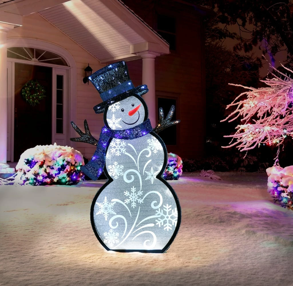 Bring the holiday spirit to your yard with this lighted outdoor snowman. This snowman features 137 warm white LED lights to brighten your lawn for a dazzling Christmas display. Constructed from flame-retardant and non-allergenic materials, the light-up snowman is a safe addition to your decorations. The included UL listed adaptor also provides extra reliability and safety.