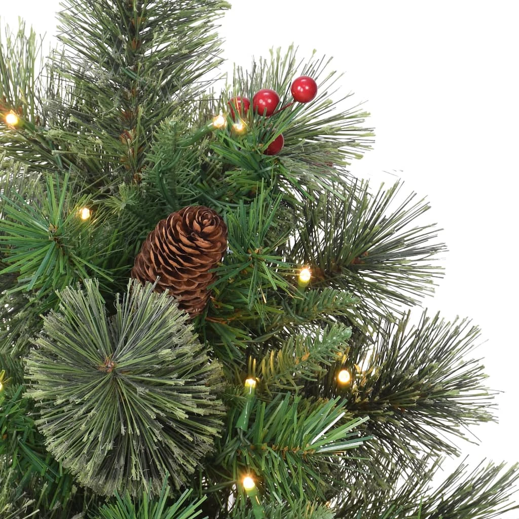Bring the holiday spirit into your home with this artificial Christmas tree. This pre-lit artificial tree features green branches and 35 warm white LED lights to brighten your home for a dazzling Christmas display. With life-like pine needles and a realistic appearance, this table top tree is sure to add warmth to any room or space for years to come. The tree is battery operated and requires 3 AAA batteries (batteries not included). The included wrapped red plastic base will safely and steadily support your tree and decorations. Constructed from flame-retardant and non-allergenic materials, this tree provides a safer alternative to real trees.