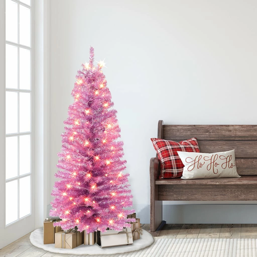 Embrace the joy of the holiday season into your home with the Puleo International Pre-Lit Artificial Tinsel Christmas Tree. Enchanting and joyful, this 4.5 ft. tall artificial holiday tree with fashion pink pine needles and an elegant conical shape perfectly captures the ambiance of the wintry forests in your home. Decorated with 70 pre-attached UL-listed clear incandescent lights, this pre-lit Christmas tree illuminates your home with a dazzling festive glow while eliminating the time-consuming hassle of hanging lights around your tree. It has a full appearance with a total of 160 PE/PVC branch tips and gorgeous life-like branches that stimulate a realistic feel of nature’s beauty. Assembly is quick with easy to hinge branches, and an attractive metal stand is included for convenient placement anywhere in your home. The flame-retardant, hypoallergenic, and needle-shed resistant tree offers a safer alternative to fresh-cut Christmas trees, so you can welcome in friends and family for holiday celebrations without worry. This product is backed by a five-year warranty on the tree and a two-year warranty on the lights for years of quality use.
