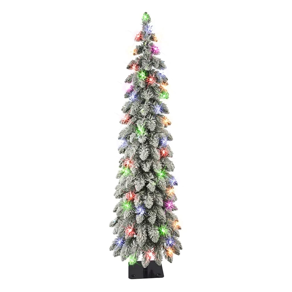 Embrace the joy of the holiday season into your home with the Puleo International Pre-Lit Flocked Alpine Pencil Christmas Tree. This four ft. tall artificial holiday tree with elegant snow-dusted pine needles stimulates a realistic feel to deliver a perfect touch of snowy ambiance even if a white Christmas is not on the forecast. Decorated with 50 pre-attached UL-listed multicolored incandescent lights, this pre-lit tree illuminates your home with a colorful festive glow while eliminating the time-consuming hassle of hanging lights around your tree. The snow flocked alpine tree has a full and natural appearance with a total of 139 branch tips and gorgeous life-like branches for an authentic wintry forest impression. Assembly is quick and easy, and a black metal stand is included for convenient placement anywhere in your home. The artificial tree’s flame-retardant and non-allergenic material construction offers a safer alternative to fresh-cut Christmas trees, so you can welcome in friends and family for holiday celebrations without worry. This product is backed by a five-year warranty on the tree and a two-year warranty on the lights for years of quality use.