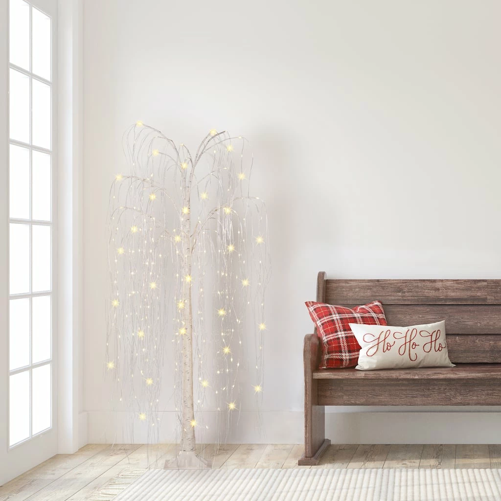 Embrace the joy of the holiday season indoors and out with this pre-lit outdoor artificial willow Christmas tree from Puleo International. Enchanting and joyful, this holiday tree is delicately designed for outdoor display to welcome in the Christmas spirit all around the block. Pearly white cascading branches perfectly capture the ambiance of a wintry forest. Decorated with 240 pre-attached warm white multifunction LED lights, this tree will illuminate your porch or patio with a dazzling festive glow while eliminating the time-consuming hassle of hanging lights around your tree.