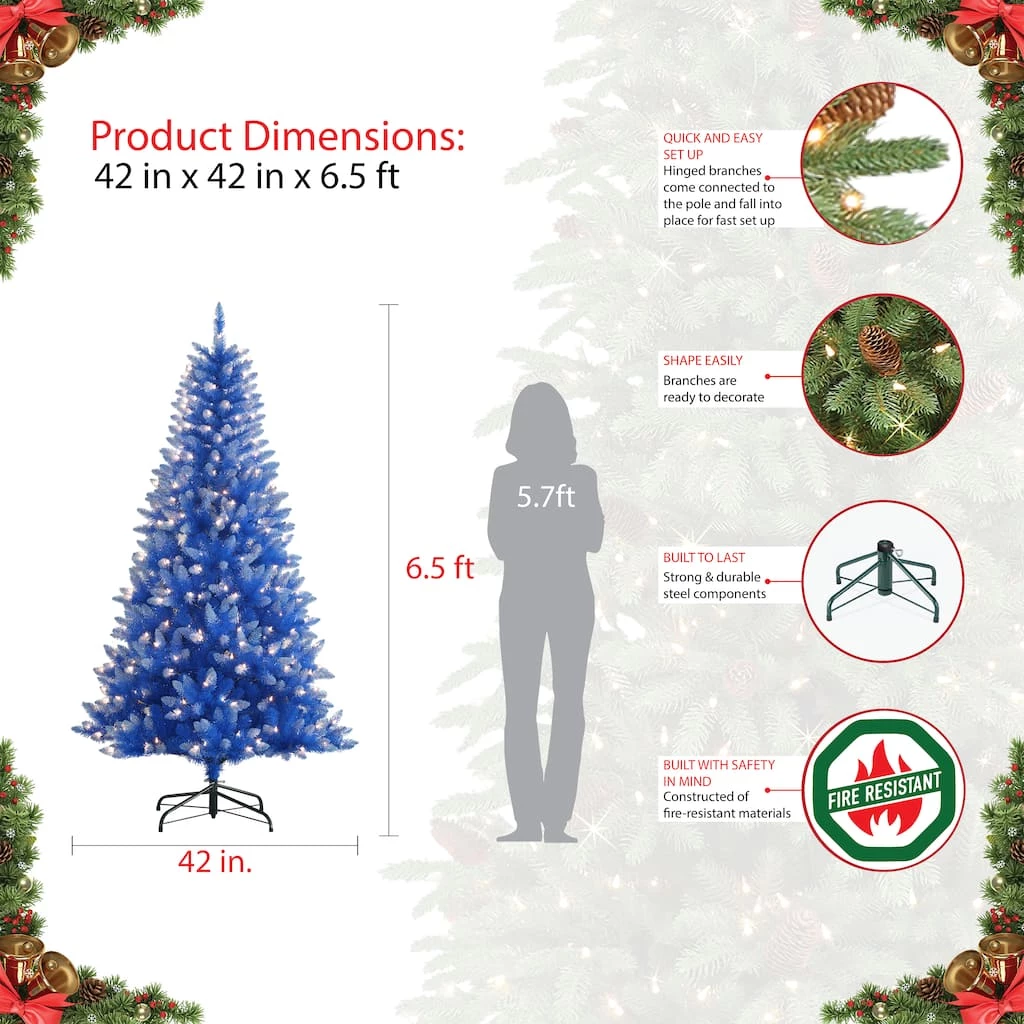 Bring the holiday spirit into your home with the Puleo International 6.5′ Artificial Christmas Tree. This pre-lit artificial tree features blue hinged branches and 300 clear incandescent lights to brighten your home for a dazzling Christmas display. With 3 easy-to-connect sections, this artificial tree is sure to add warmth to any room or space for years to come. The included sturdy metal base will safely and steadily support your tree and decorations. Plus, if one bulb burns out, the rest remain lit. Constructed from flame retardant and non-allergenic materials, this tree provides a safer alternative to real trees.
