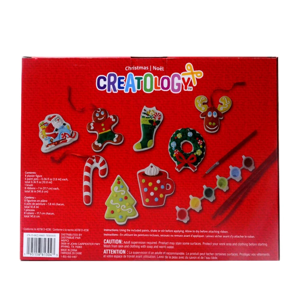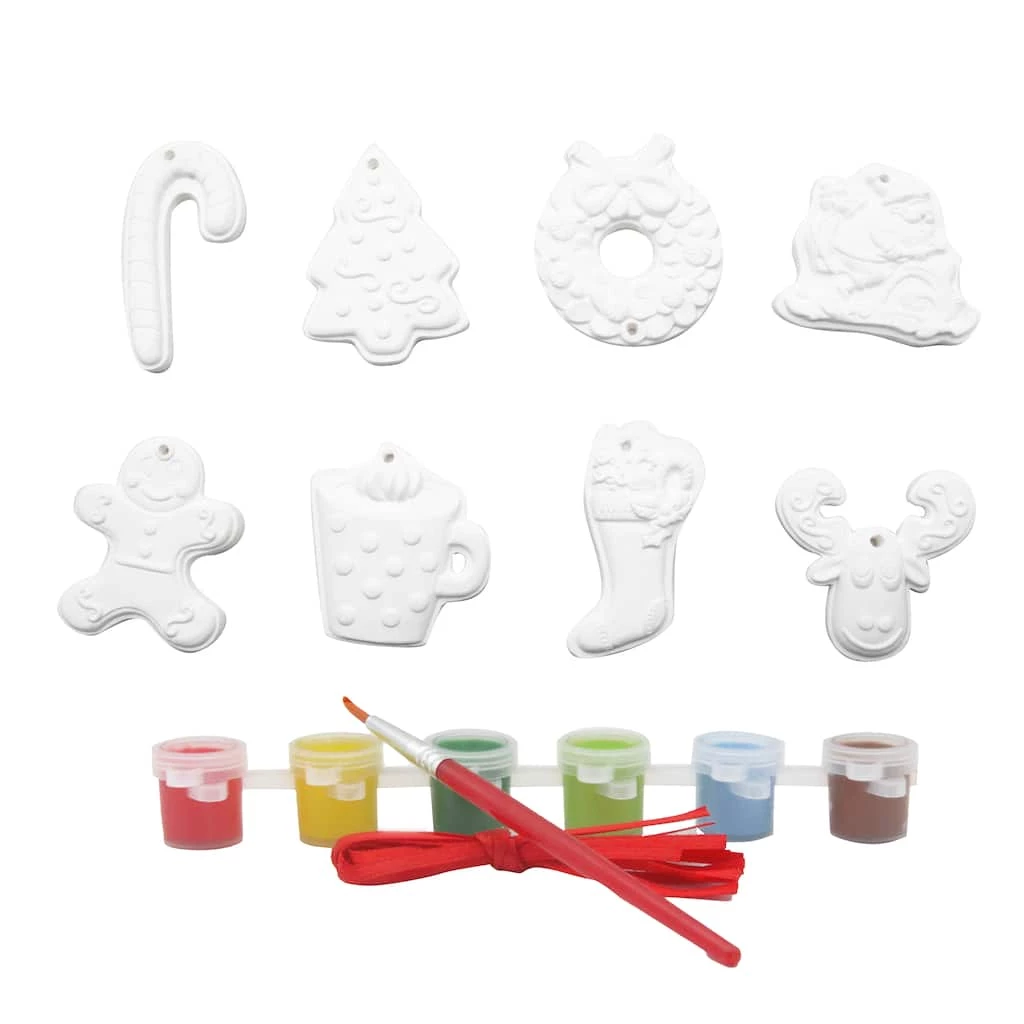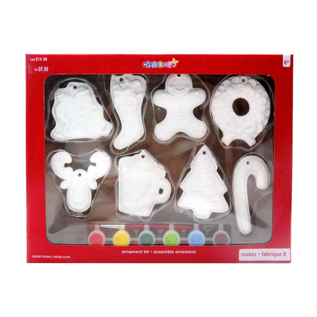 Bring in the holiday cheer by painting these plaster ornaments by Creatology. This kit includes all materials to personalize 8 ornaments. Once dry and complete, attach ribbon and hang on your Christmas tree.