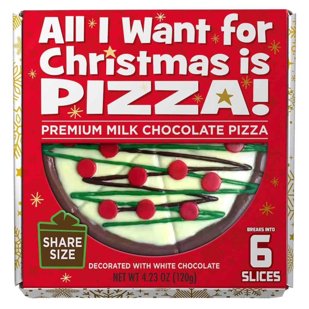 A fantastic treat to enjoy one day at a time or share with friends, this Christmas-themed milk chocolate pizza decorated with white chocolate is a great party addition as you celebrate the holiday season.