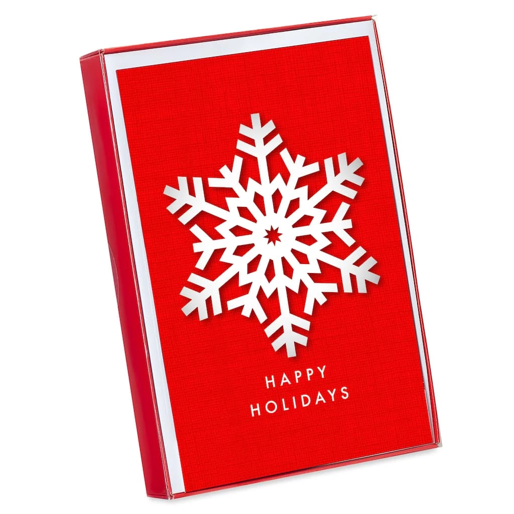 Add a touch of classic charm to the Christmas season with this box of cards featuring a single white snowflake on a red background. With a festive holiday wish inside, these cards are sure to warm the hearts of friends and family alike.