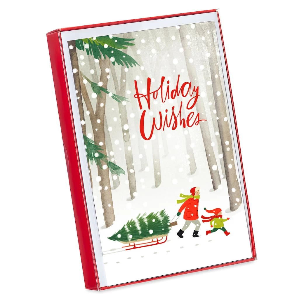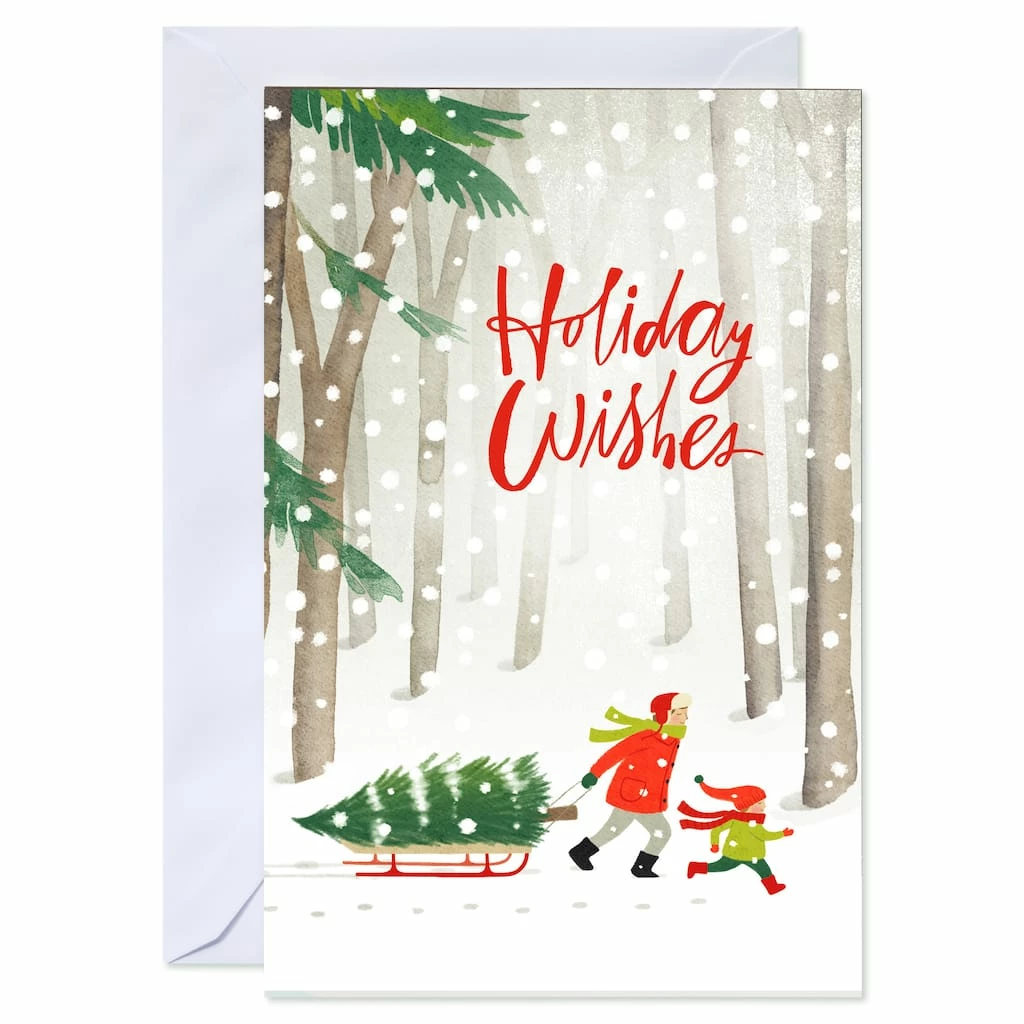 Add a lovely wintry touch to the Christmas season with this box of cards featuring an illustration of kids sledding in a snowy forest. With a festive holiday wish inside, these cards are sure to warm the hearts of friends and family alike.