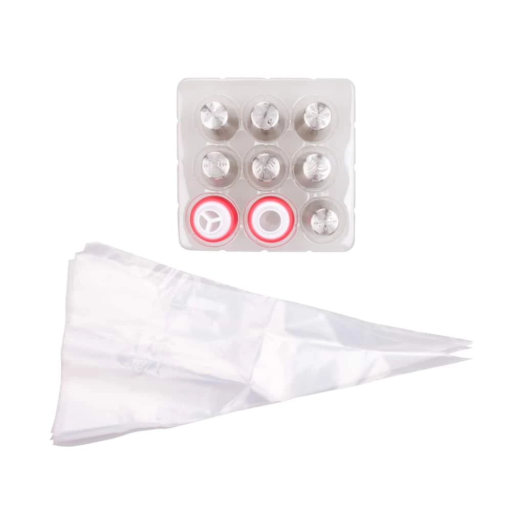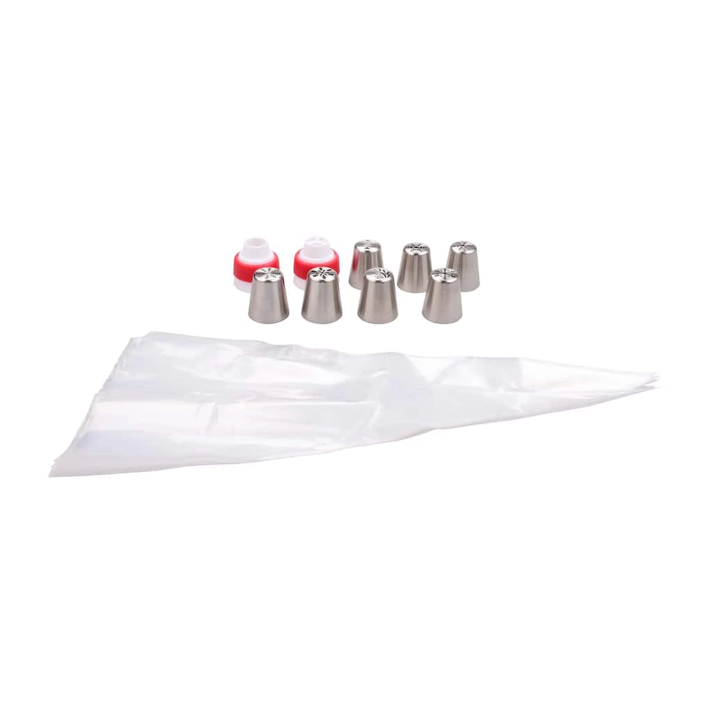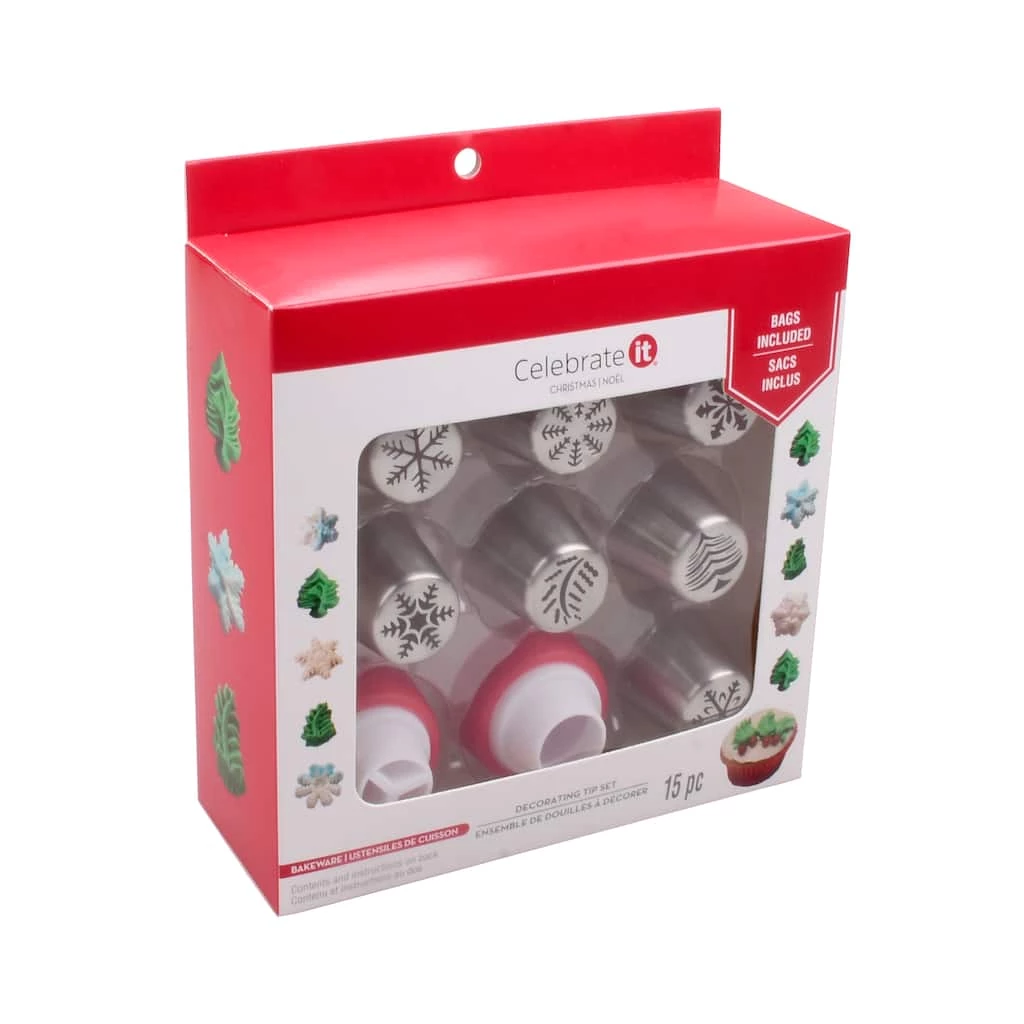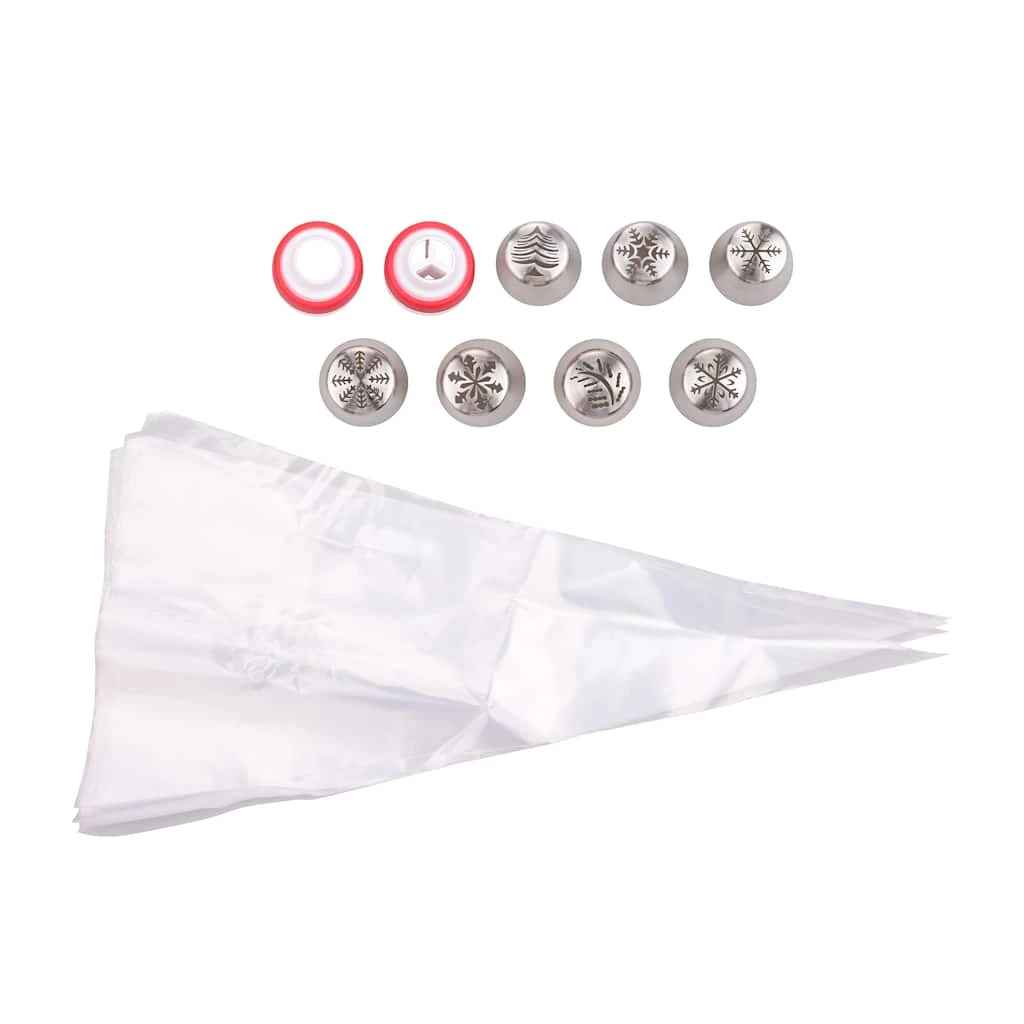 Make Christmas-themed dollops for cupcakes, treat bars, and more with this tip decorating set. It features a variety of holiday-inspired shapes!