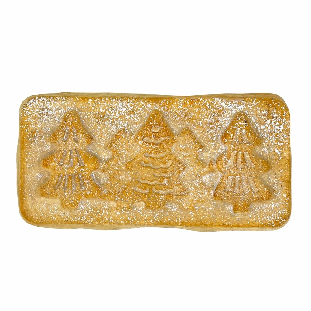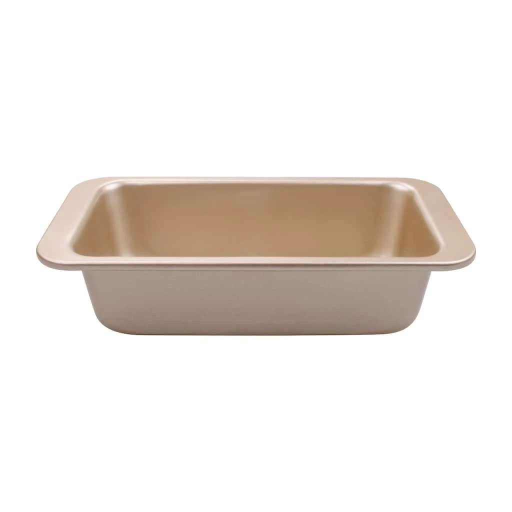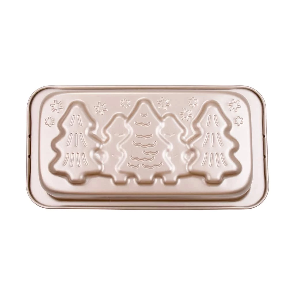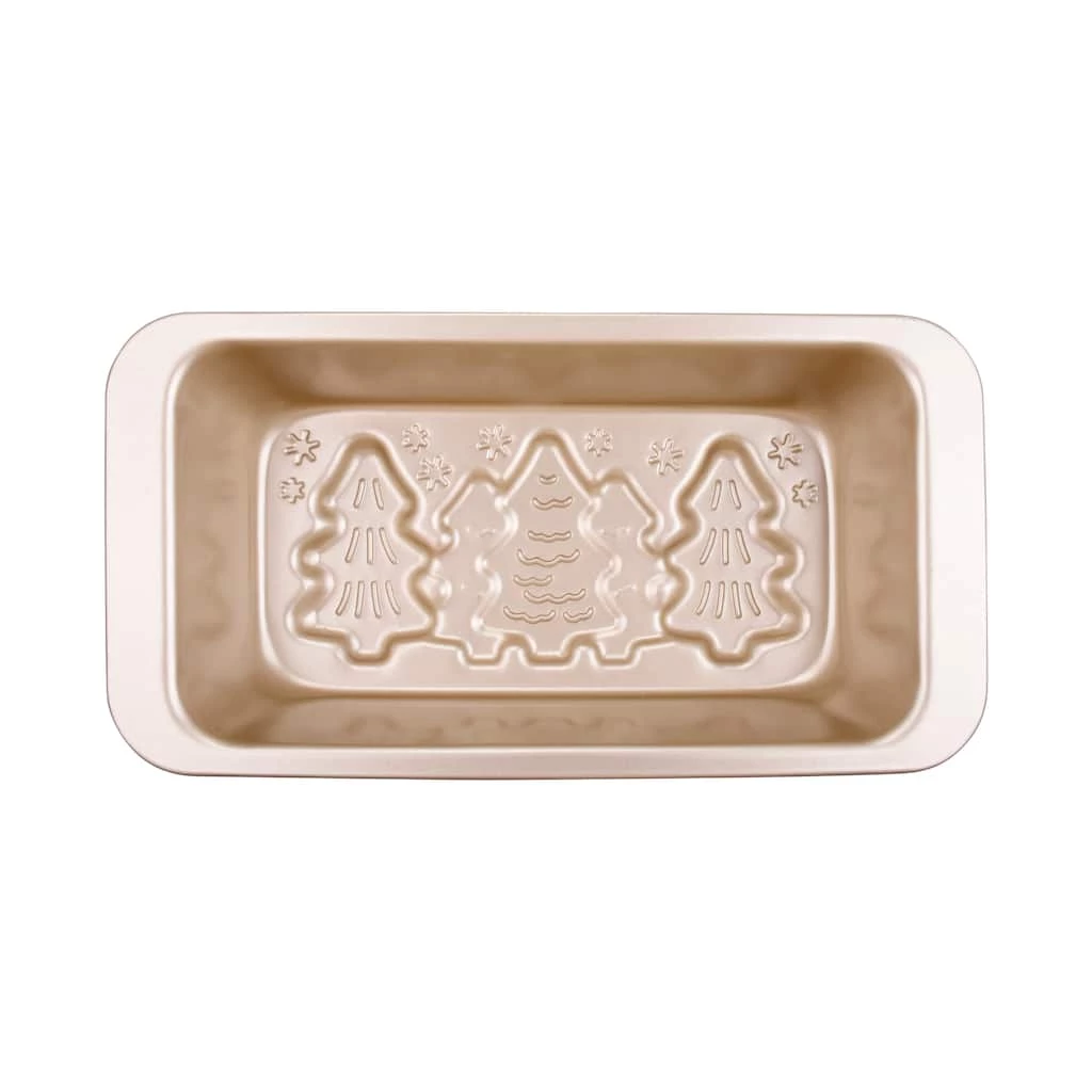 Create a fun and tasty treat with this loaf pan. It features Christmas tree designs stamped in gold carbon steel material. Durable, yet, lightweight, this pan will be a great addition to you holiday baking tools.