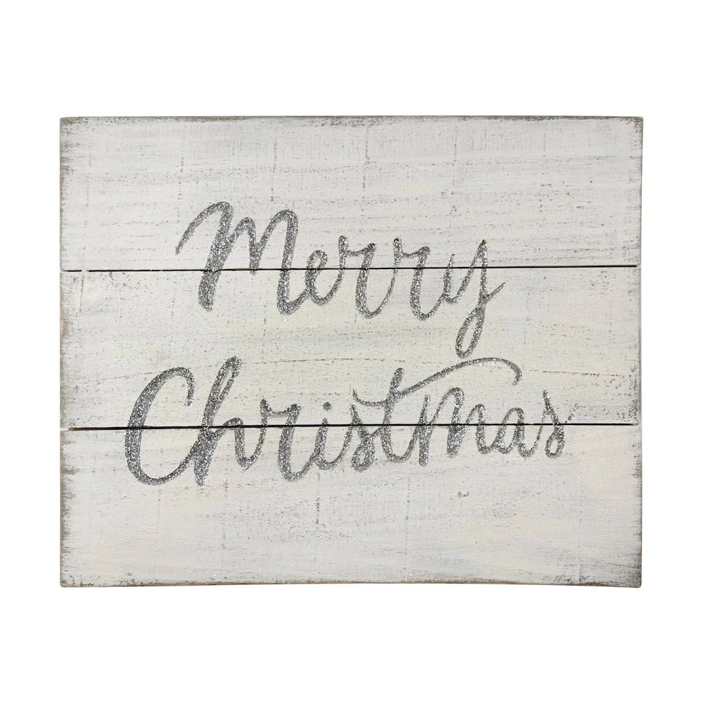 - Whitewashed finish with silver glitter script