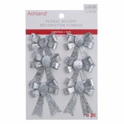 Bring festive cheer to your holiday dΓ©cor with this charming set of silver bows from Ashland. Featuring bright glitter accents, these gifts will be right at home on a mini Christmas tree on your side table or mantel.
