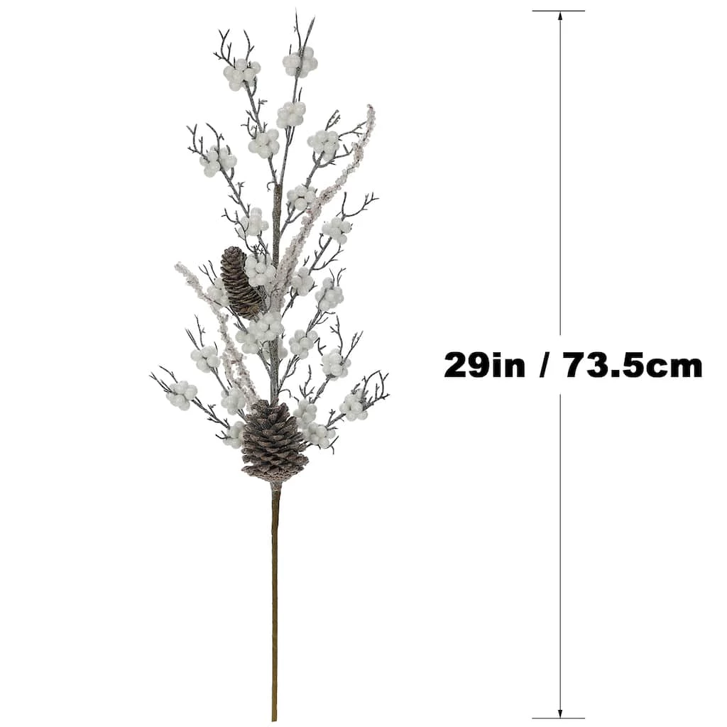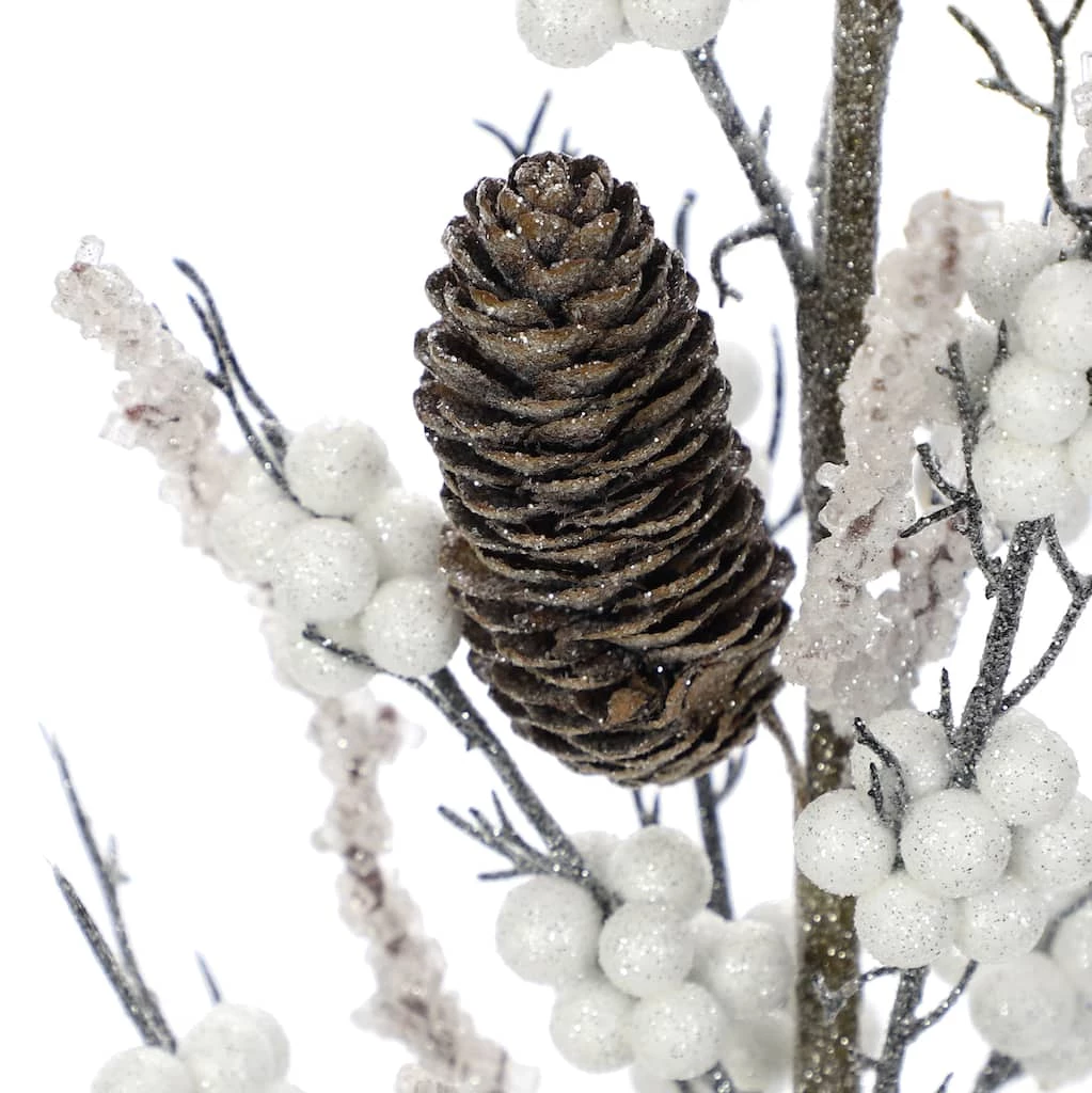 With frosty white berries and a dusting of glitter, this berry and pinecone stem will add a lovely shimmery touch to your Christmas floral projects. Use to bring depth to handmade wreaths and holiday décor or create a stunning arrangement along with frosted pine stems and brilliant red blooms in a tall vase.