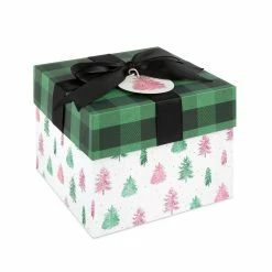 Featuring a fun pattern of tree illustrations with a green buffalo plaid lid, this charming box is a fantastic way to dress up your holiday presents with festive flair. With a pretty satin bow and coordinating tag, use for decorating under the tree or to hold a special gift sure to stand out as you celebrate the Christmas season with your loved ones.