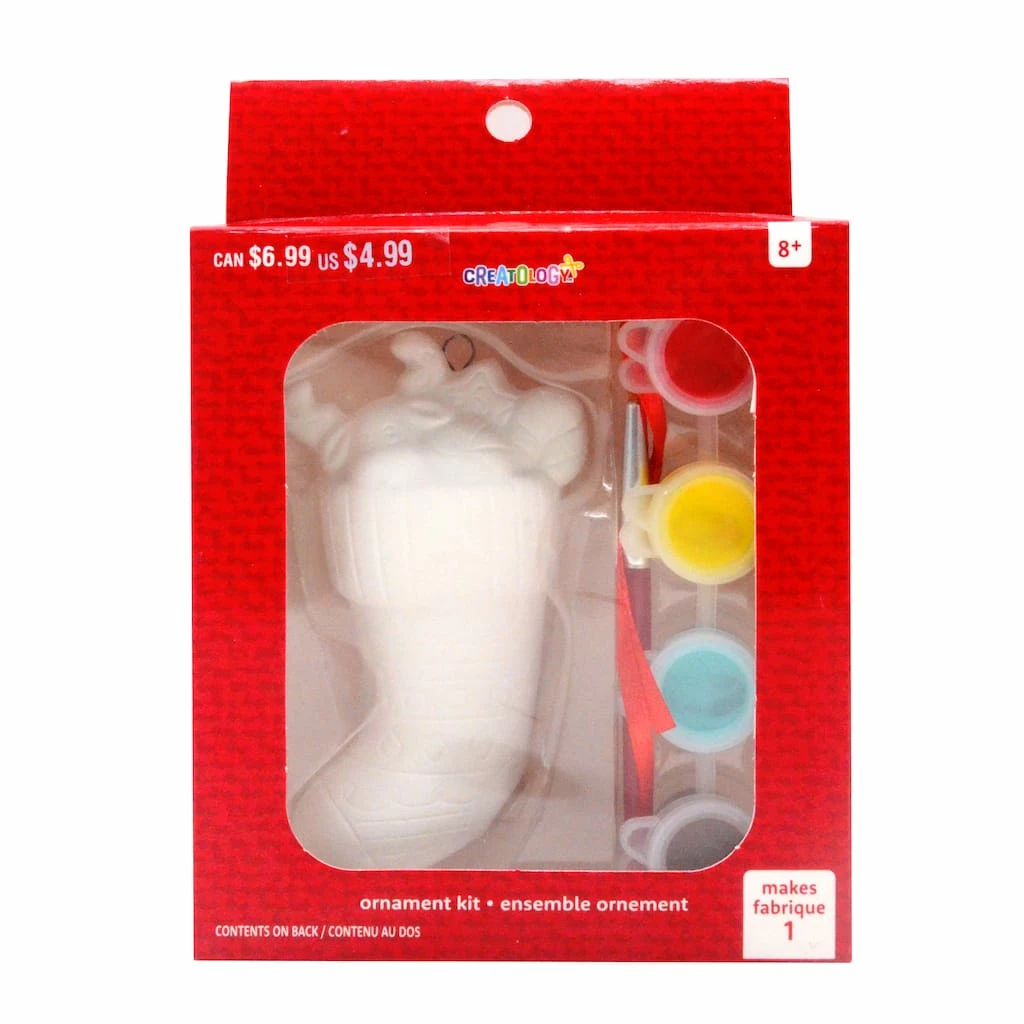 Bring in holiday cheer by painting this ceramic stocking ornament by Creatology. This kit includes all materials to transform the included piece into a holiday favorite. Once dry and complete, attach ribbon and hang on your Christmas tree.