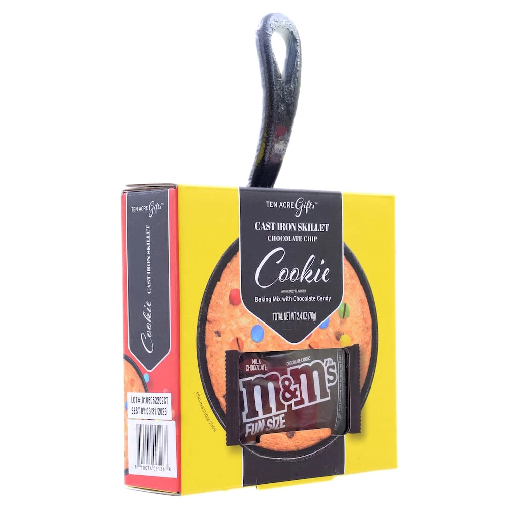 The perfect gift for the cookie-lover in your life or a scrumptious Christmas Eve treat, this skillet baking set from Ten Acre Gifts includes a sturdy small cast iron skillet, chocolate chip cookie baking mix and a fun size pack of M&M’s milk chocolate candies.